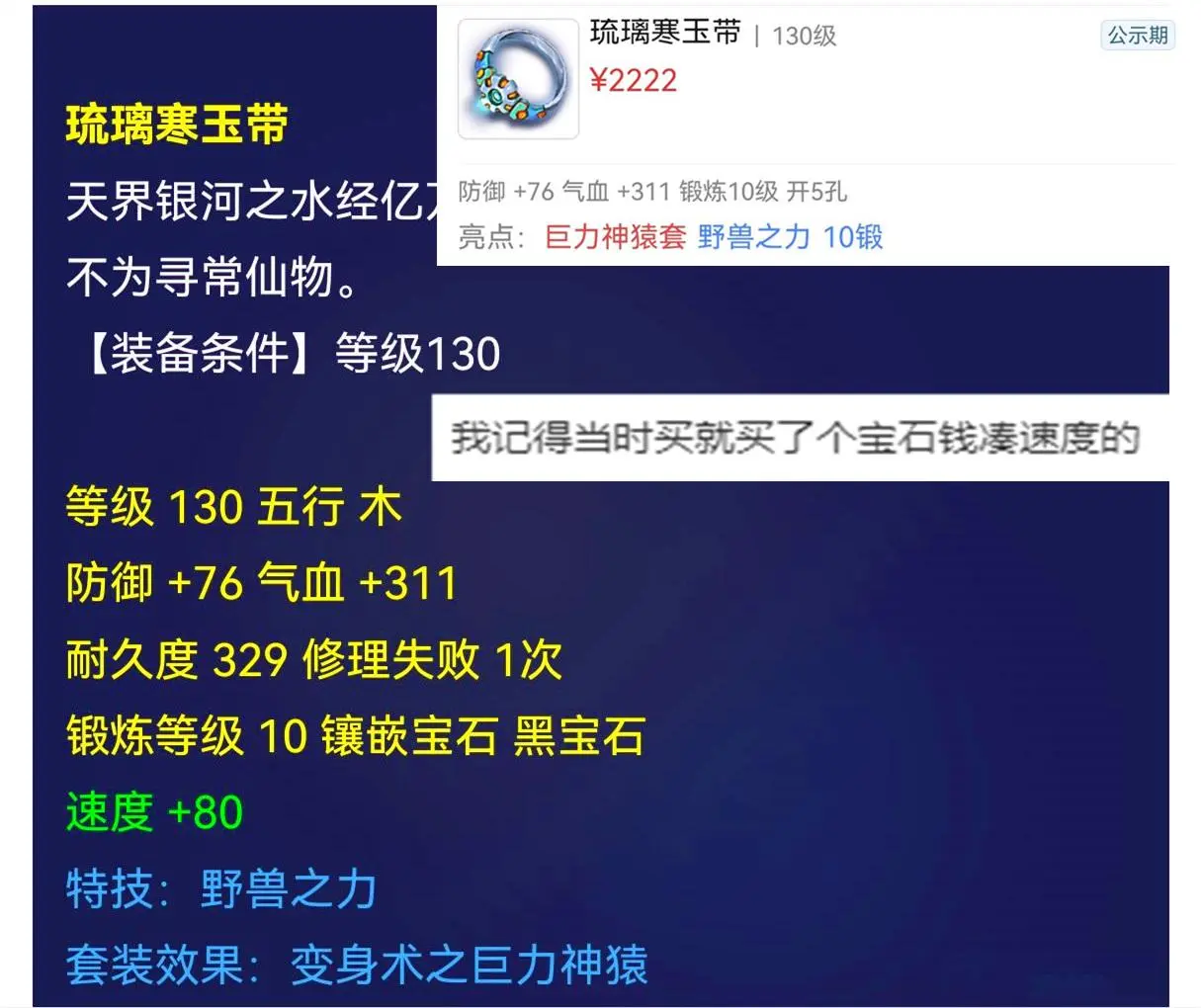 买宝石送的装备价格涨了几十倍,130的野兽腰带2222被秒