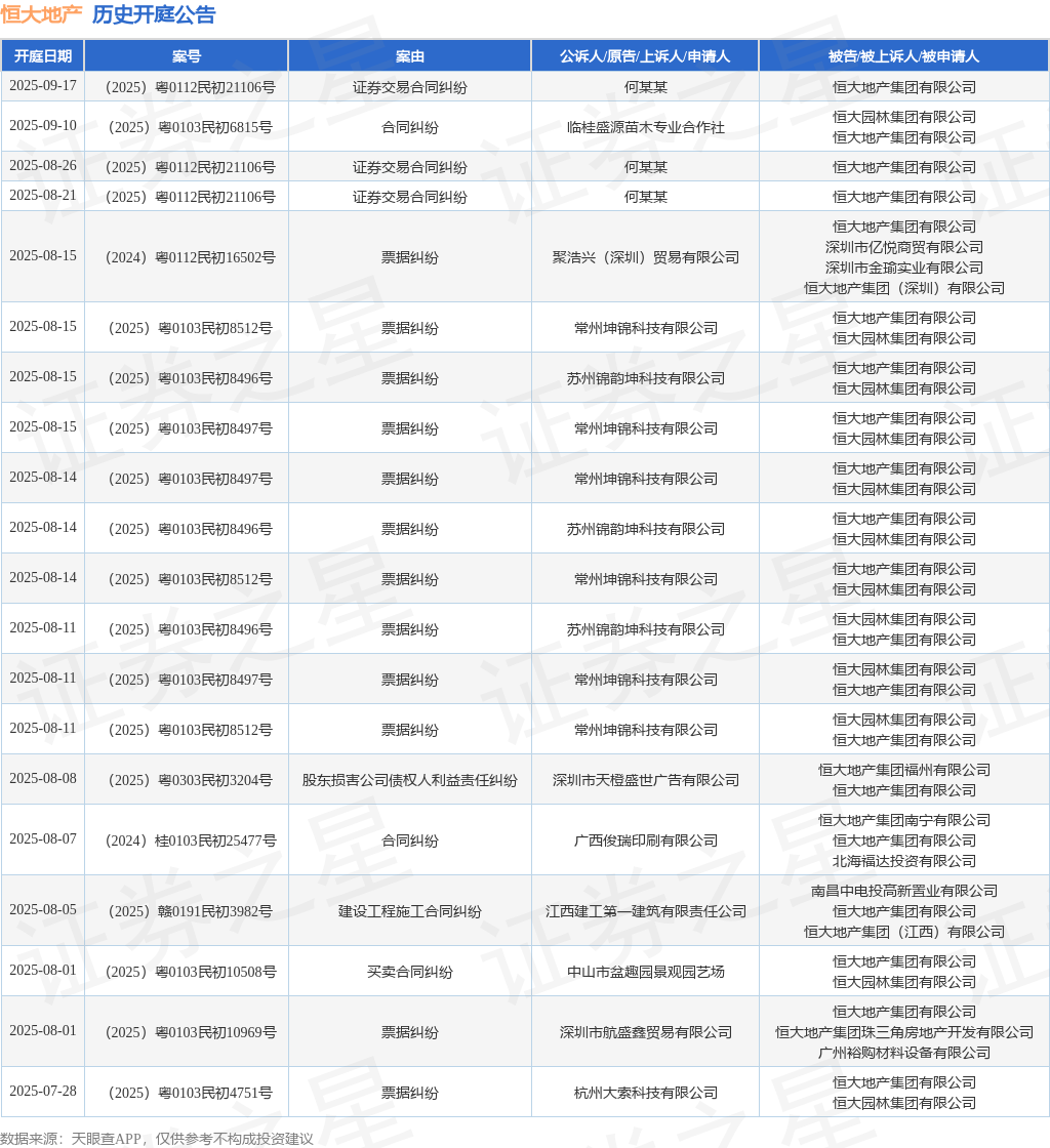 案号:(2025)粤0103民初6102号审理法院:广州市荔湾区人民法院案由:票据纠纷当事人信息: 原告/上诉人:安阳鸿邦贸易有限公司 被告/被上诉人:恒大地产集团有限公司、溧阳市戴埠园林绿化工程有限公司、恒大园林集团有限公司开庭日期:2025年6月19日根据统计,近一年内以恒大地产集团有限公司为当事人的历史开庭公告有1963则,其中案由为“票据纠纷”的公告以483则居首,其次为“合同纠纷”有471则,“建设工程施工合同纠纷”有313则。历史开庭公告(前20条)如下: